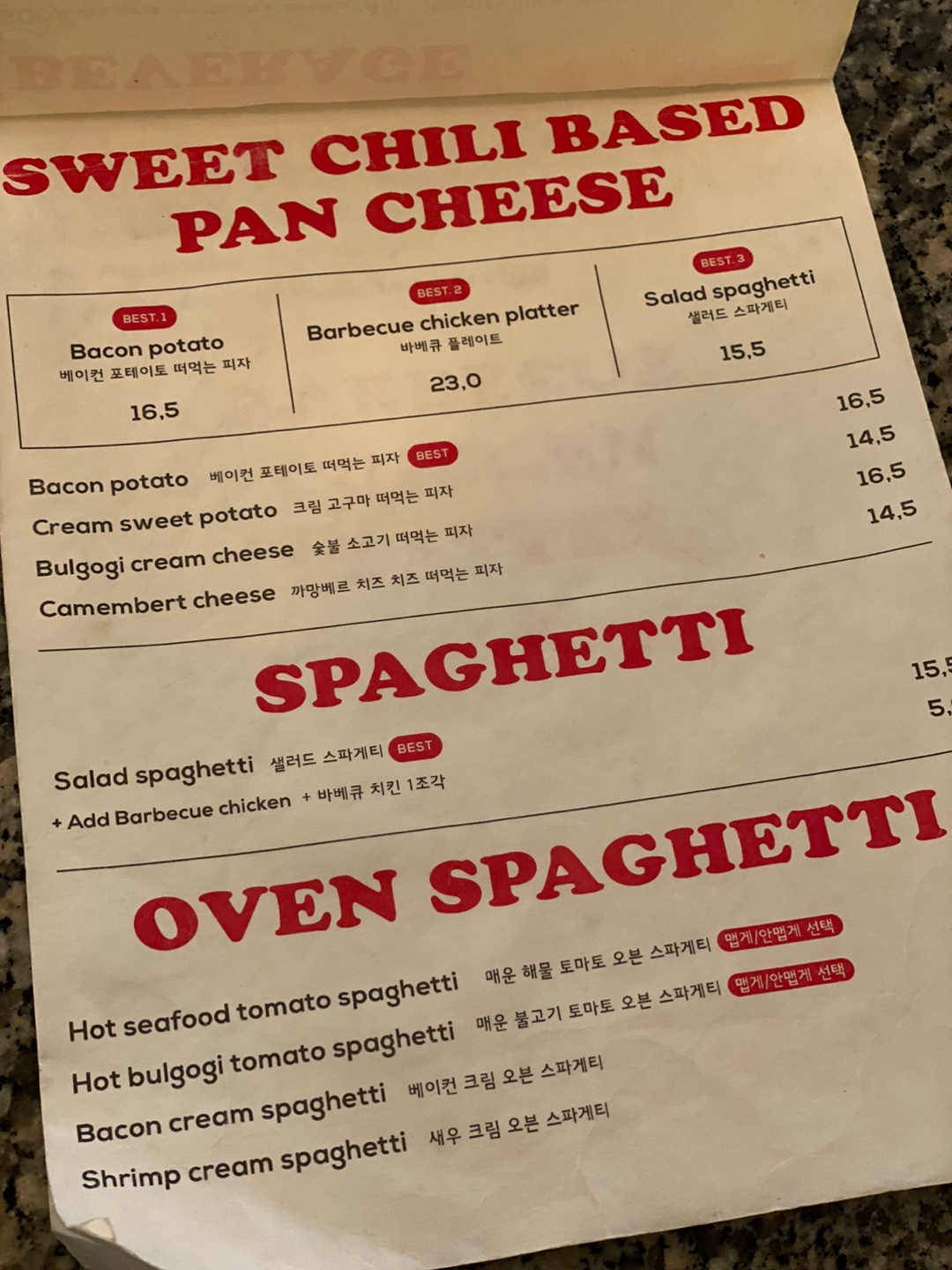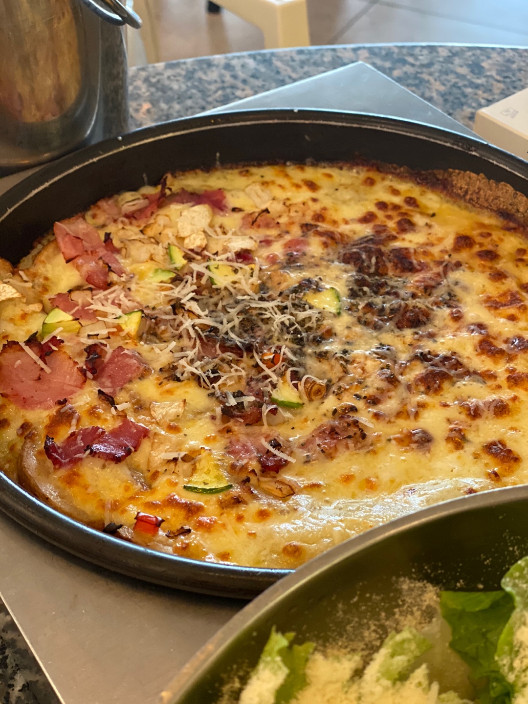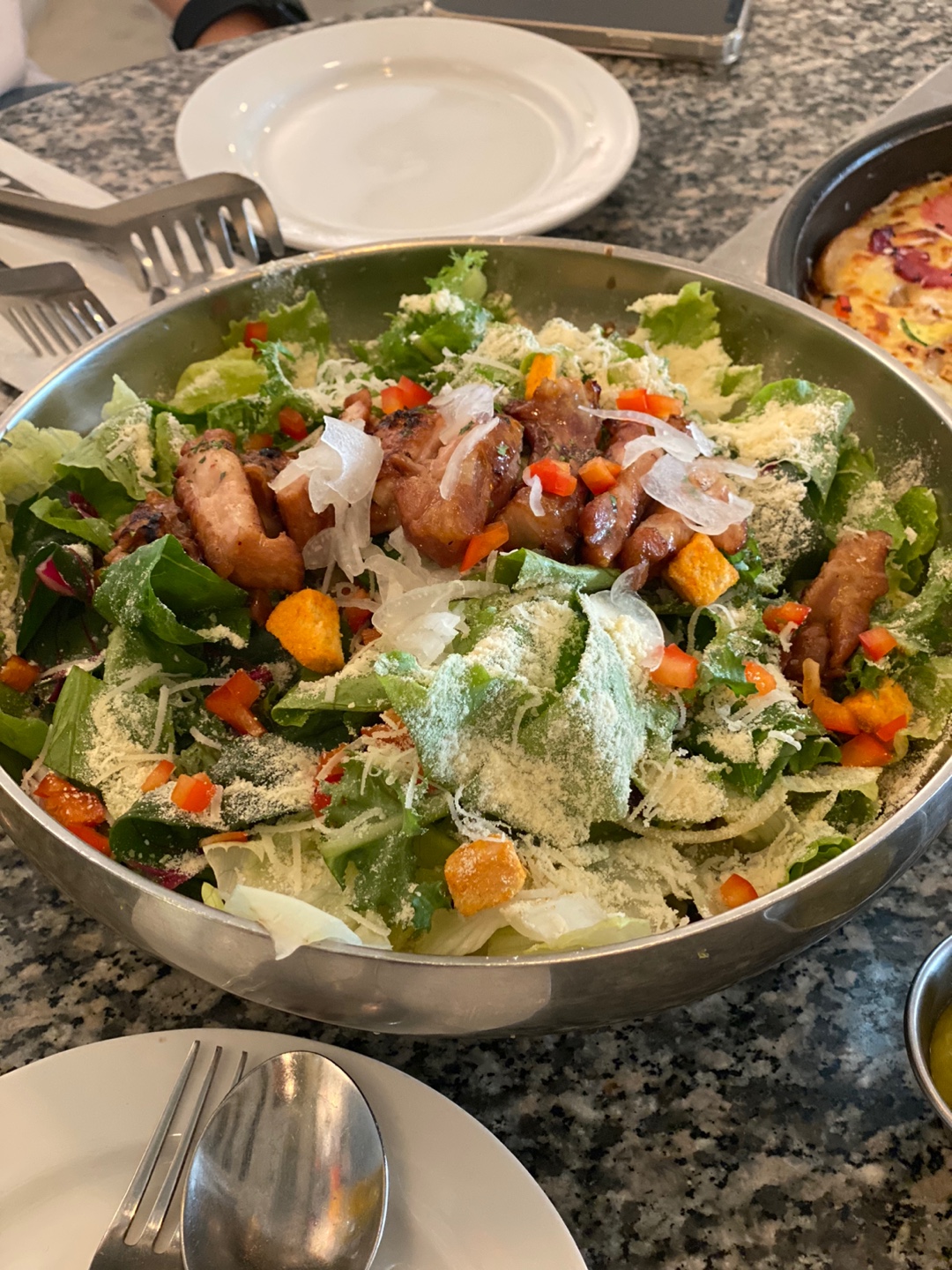 팬치즈는 도우가 얇아서 부담 없이 먹기 좋았다. 토핑으로는 감자, 베이컨, 옥수수콘, 양파, 피망 등이 푸짐하게 올라가 있었다. 샐러드 파스타에 정신이 팔려서 한참을 먹다가 피자를 떠먹었는데 금방 굳어졌다. 이건 나오자마자 빨리 먹는 게 좋다.