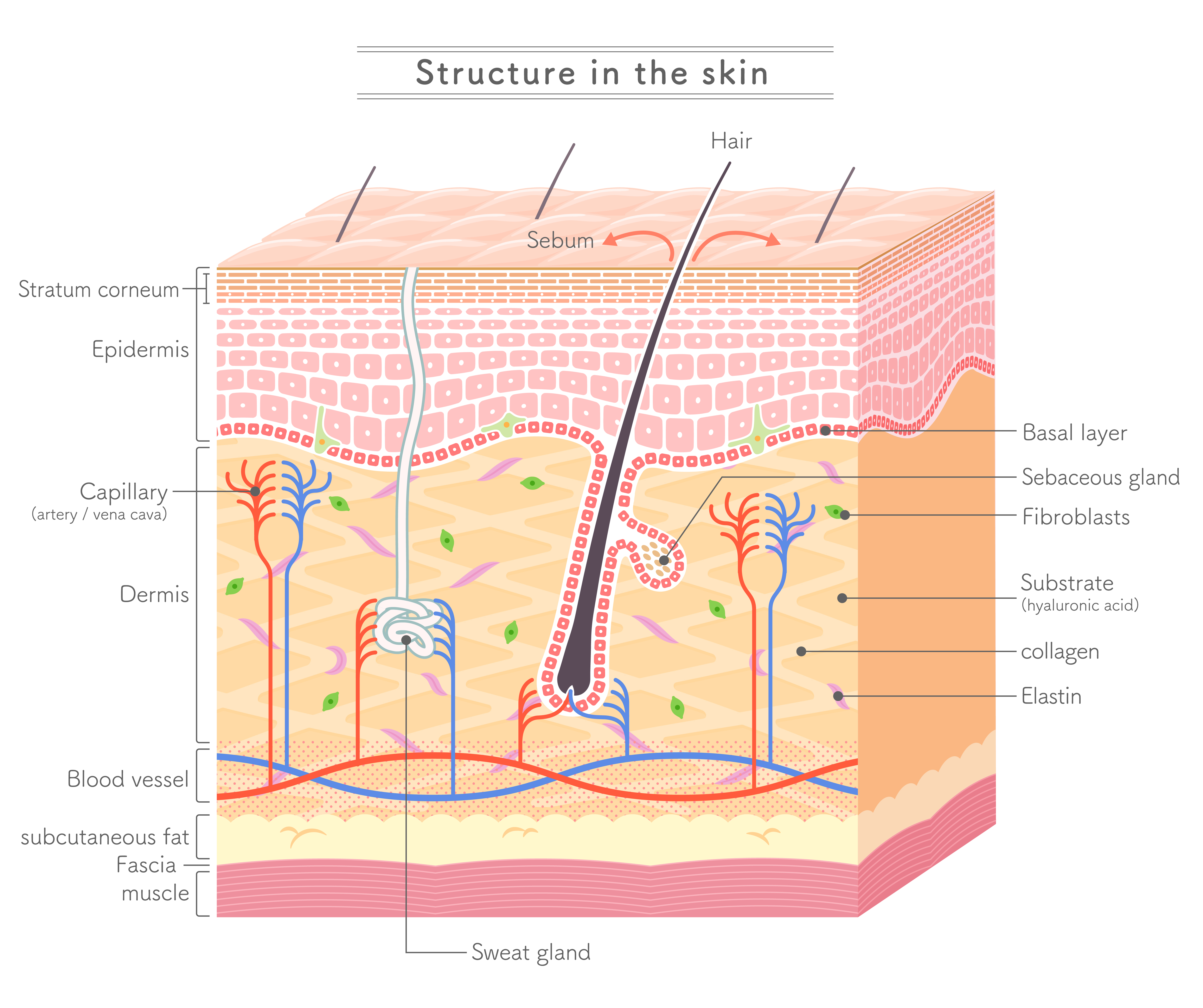 피부는 우리 몸에서 가장 넓은 면적을 차지하는 기관으로 몸무게의 약 7%를 차지하며 전체 면적은 2㎡정도 이다. 피부를 자세히 살펴보면 표피, 진피, 피하지방층으로 나누어 볼 수 있다. 피부의 가장 바깥 층인 표피에서는 각질 세포를 끊임없이 생성해 외부 자극으로부터 피부가 견딜 수 있도록 장벽 역할을 한다. 표피 아래에 있는 진피는 매우 복잡하게 얽혀 있는데 진피에 있는 신경은 통증, 온도, 접촉, 압력 등에 대한 느낌을 전달하고 빠르게 대처 함으로써 우리 몸을 보호하는 역할을 한다. 마지막으로 진피 아래에 있는 피하조직은 우리가 섭취한 에너지 중 남은 부분이 지방 형태로 피하조직에 저장이 된다. 이 피하지방은 충격 완화 작용과 체온을 유지하는 역할을 하며 비상시에는 이를 분해해 에너지로 쓰기도 한다.